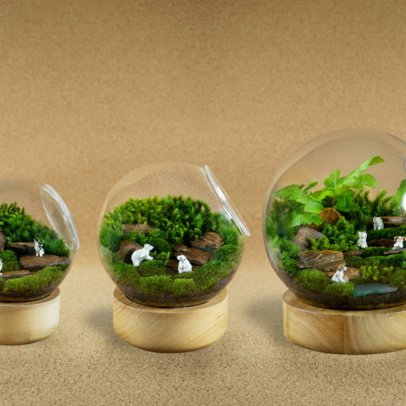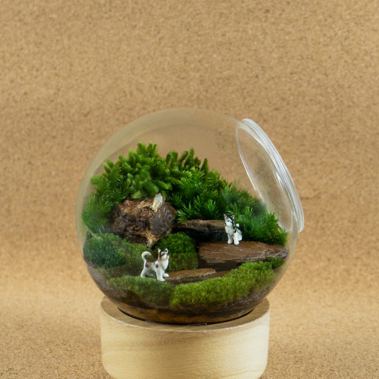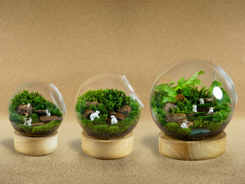 The small-size glass container on wood plate with the panoramic mountain and lake view in terrarium. สวนขวดในภาชนะแก้วทรงกลมขนาดเล็กบนฐานไม้ มองเห็นได้รอบด้าน พร้อมวิวแบบภูเขาและทะเลสาบด้านหน้า